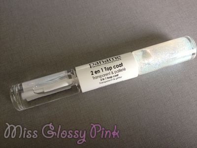 J’ai utilisé le top coat pailleté uniquement sur l’annulaire pour une petite touche de fantaisie mais vu que ça reste assez discrèt, ça ne choquerait pas du tout de le porter sur tous les ongles ^^